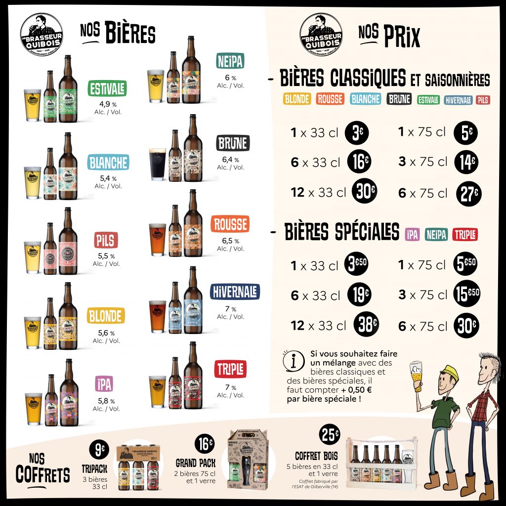 01Sep170 Petit rappel du prix de nos bières en vente directe, autrement dit : au marché de Quibou, tous les jeudis de 16h à 19h. Actualité